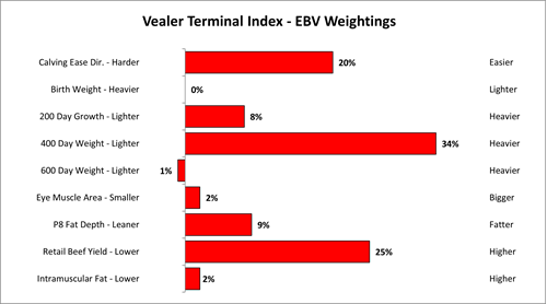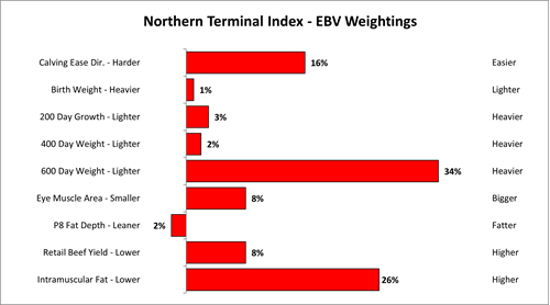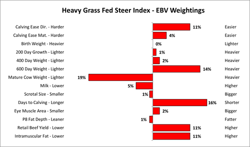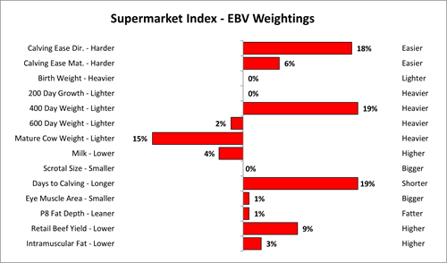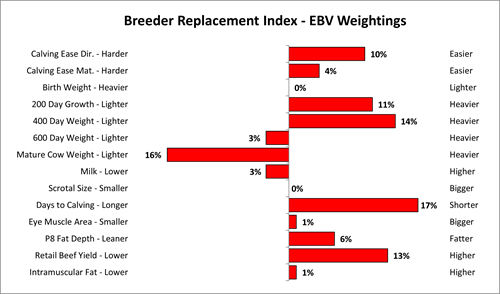 The weightings are calculated using BreedObject software that analyses all sources of costs and income for the production system represented by each selection index. As such, selection indexes account for both sides of the profit equation and reflect the short and long term profit possible through selection of superior genetics. For example, short term profit can be generated by a bull through the sale of his progeny, and the longer term profit generated by his daughters in a self-replacing cow herd.
