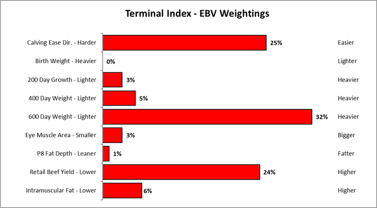 The weightings are calculated using BreedObject software that analyses all sources of costs and income for the production system represented by each selection index. As such, selection indexes account for both sides of the profit equation and reflect the short and long term profit possible through selection of superior genetics. For example, short term profit can be generated by a bull through the sale of his progeny, and the longer term profit generated by his daughters in a self-replacing cow herd.